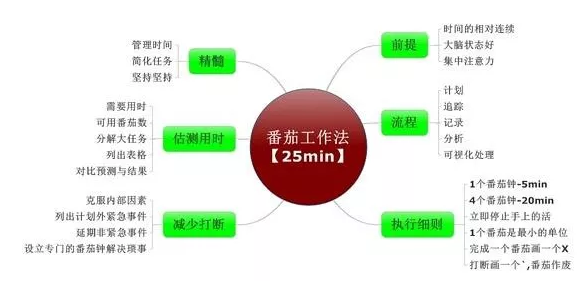 番茄工作法是由弗兰西斯科·西里洛发明,是一种简单易行的时间管理方法,在时间管理方面相对于更加微观。使用番茄工作法,选择一个待完成的任务,设定一个番茄时间,在番茄时间内专注工作,中途不允许做任何与该任务无关的事,直到番茄钟响起,然后在纸上画一个记号,记录下来;然后设定一个番茄休息时间,短暂休息一下。结束一天的工作后,根据记录对当日的工作学习情况进行复盘,同时可以对第二天的时间进行规划。